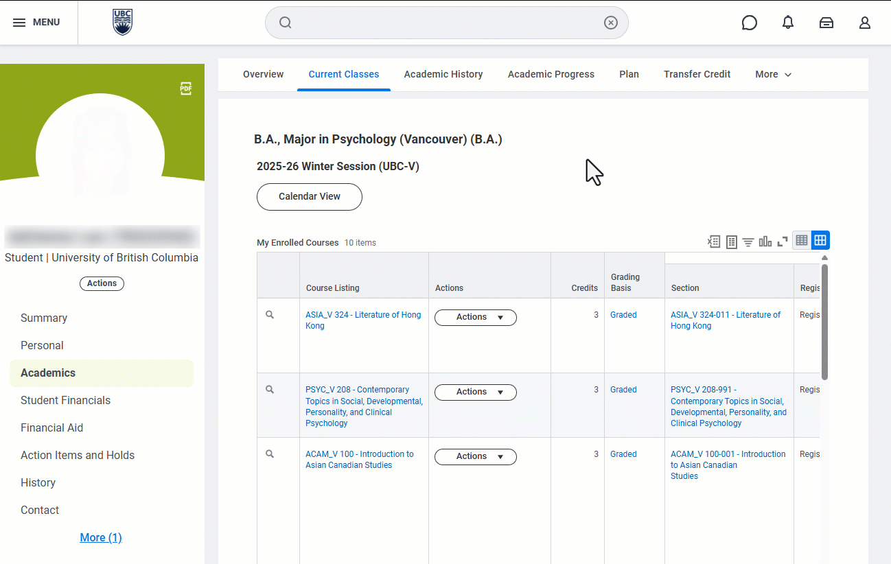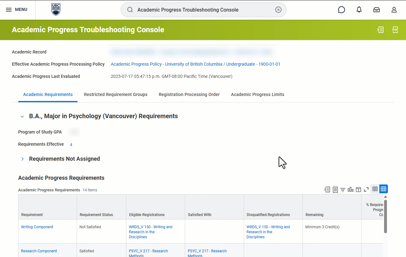 - Academic requirements, including which courses have been applied to which requirements and why certain courses apply or don’t apply to specific requirements based on UBC’s criteria.